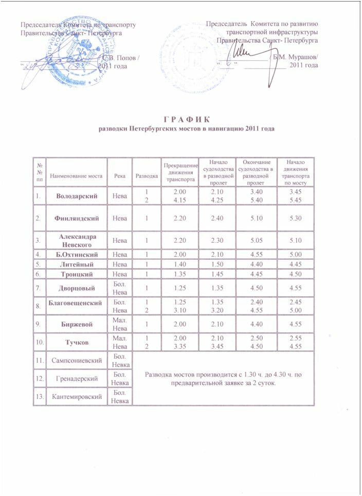 График-расписание разводки мостов в Петербурге в навигацию 2012