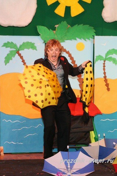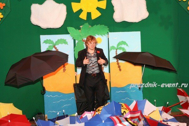 За время представления Ваши гости смогут увидеть такие уникальные трюки и фокусы, как появление зонтика из воздушного шара, клонирование зонтиков, появление двойных и даже тройных зонтов, зонтики из платков или просто из воздуха, некоторые даже поменяют цвет. Попутно будут совершатся чудеса с цветами платками волшебными палочками и флагами. Ну и в финале фонтан из разноцветных зонтиков!